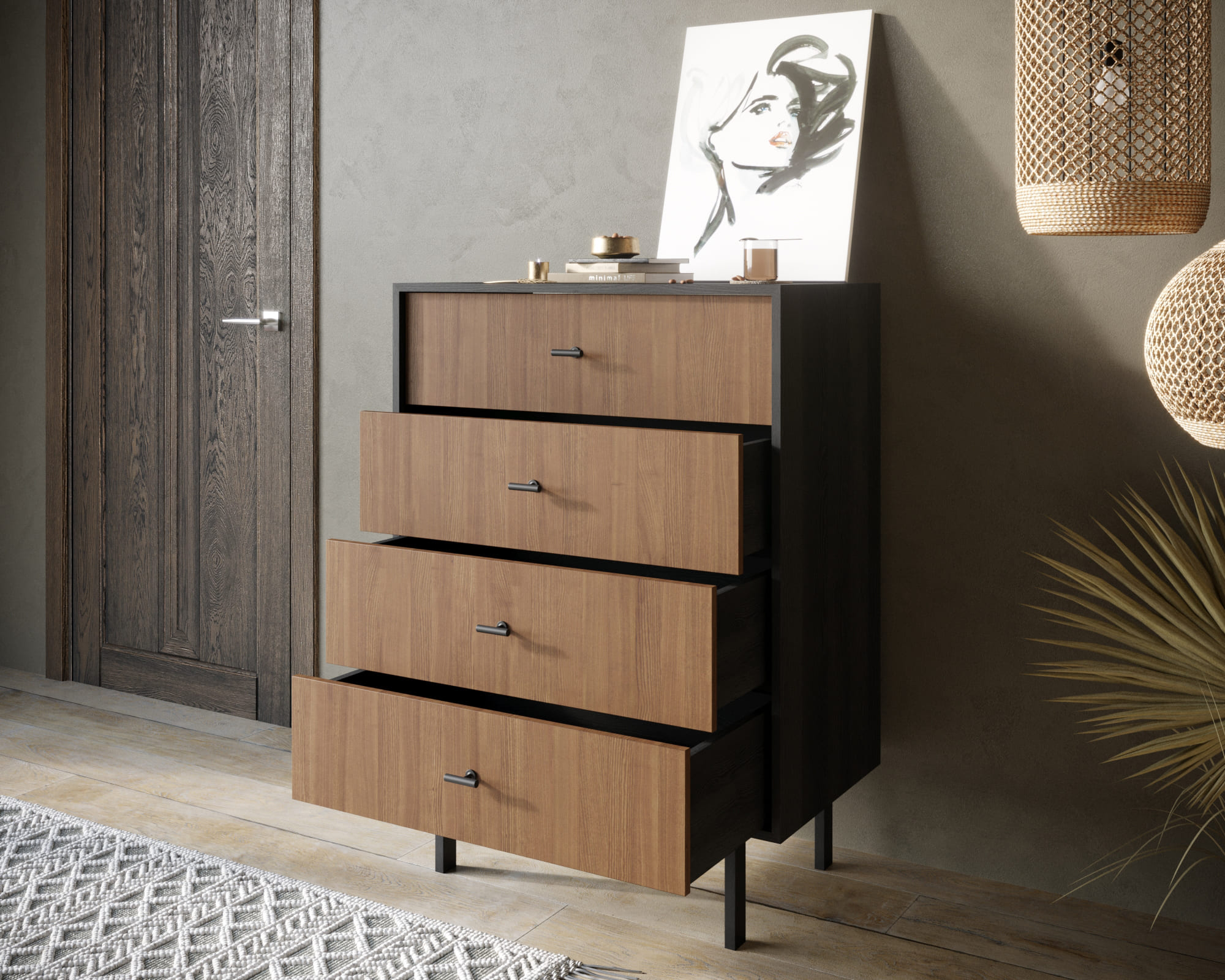 Мы предлагаем различные варианты исполнения: с фасадами или с фасадами и ящиками. Петли с доводчиком обеспечивают плавное закрывание дверей, а шариковые направляющие без доводчика позволяют легко выдвигать ящики. Комод поставляется в сборе, что упрощает его установку.
