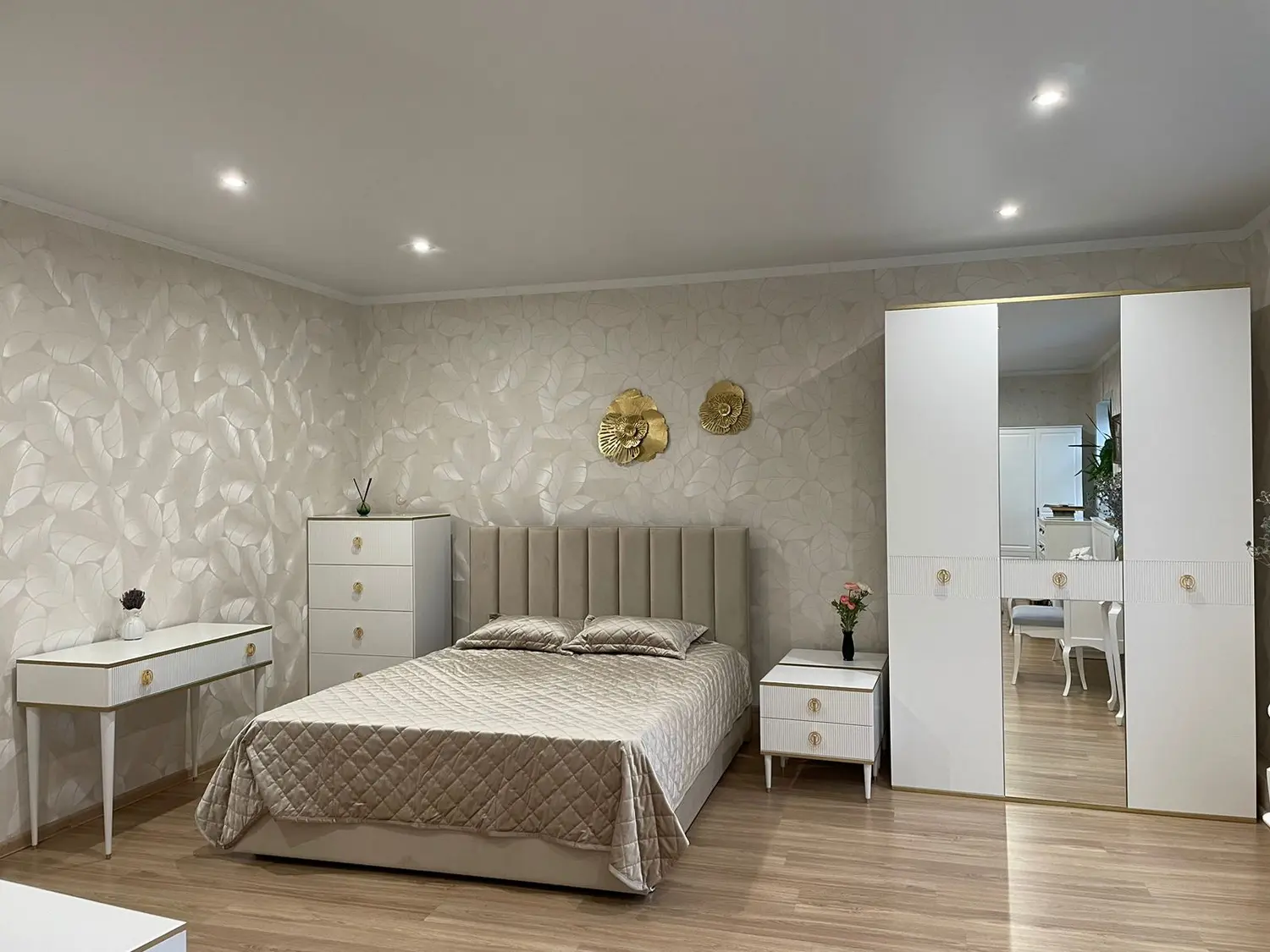 Фрезерованные фасады изящно сочетаются с металлическими ручками, ножки с золотой каймой завершают элегантный стиль модели.