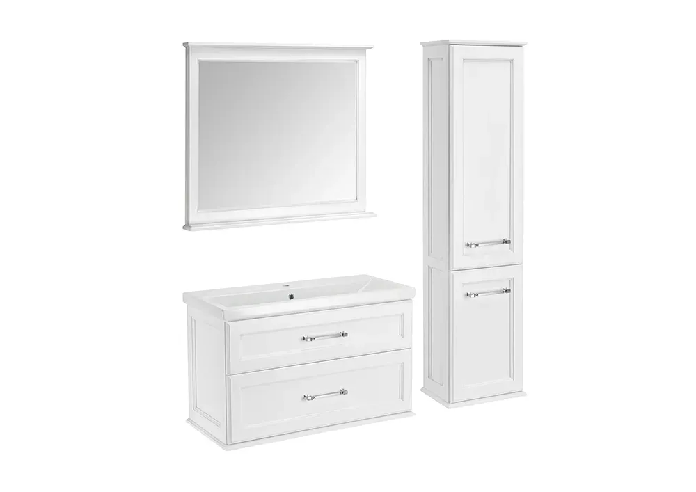 Коллекция выполнена в белом цвете, который гармонично впишется в любой интерьер. Фасады и корпуса тумбы и пенала, а также оправа зеркала изготовлены из массива ясеня, покрытого матовым лаком с сохранением текстуры дерева. В комплект входят стеклянные полки, которые придают изделию легкость и воздушность.